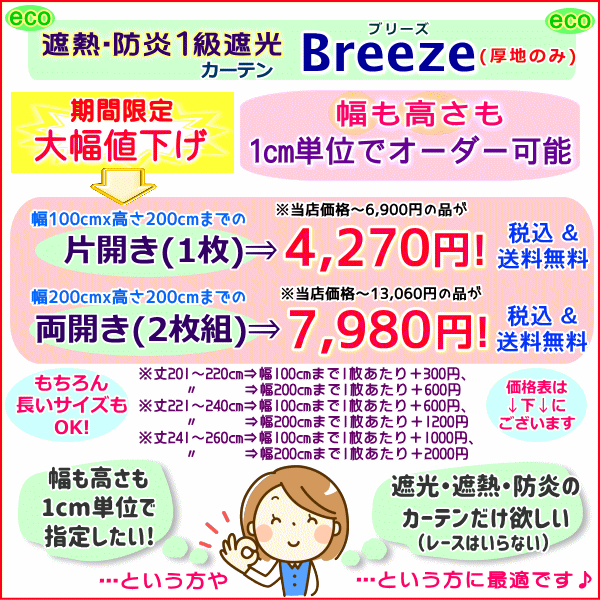 遮熱・1級遮光・防炎カーテン「ブリーズ」【オーダーカーテン】 幅201〜300cmを両開きx高さ〜260cmまで※幅150cmまで2枚 (Dサイズ)1cm単位指定可能【即納】 |