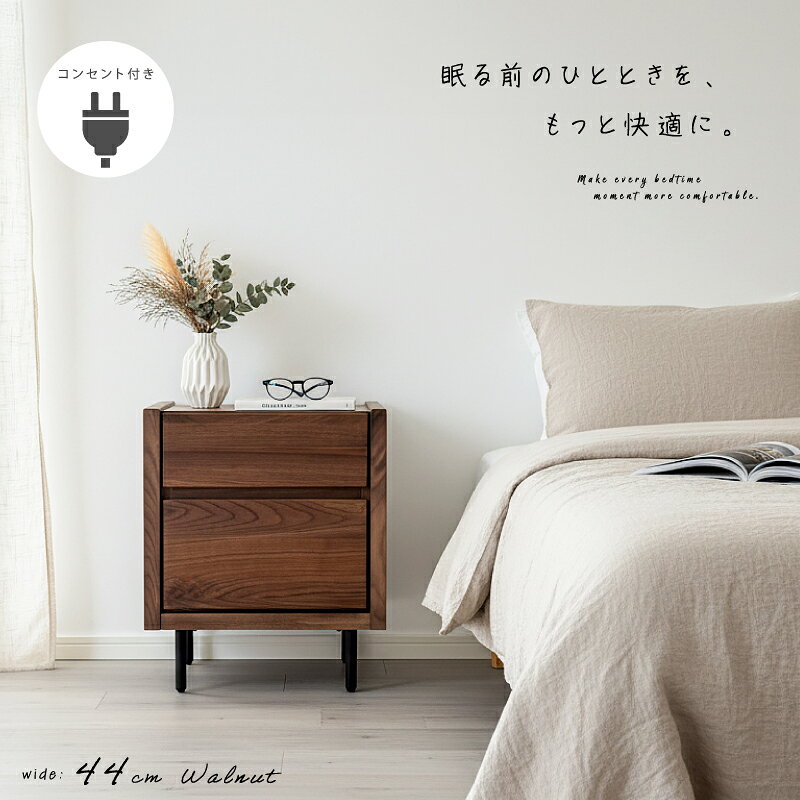 [7%値引クーポン☆ブラックフライデー] すぐに使える完成品! サイドチェスト ウォールナット ナイトテーブル コンセント付 おしゃれ 完成品 黒脚 引き出し 収納 北欧 サイドテーブル 44幅 2段 スライドレール ブラウン 茶 コンセント付き 脚付 寝室 ベッド モダン |