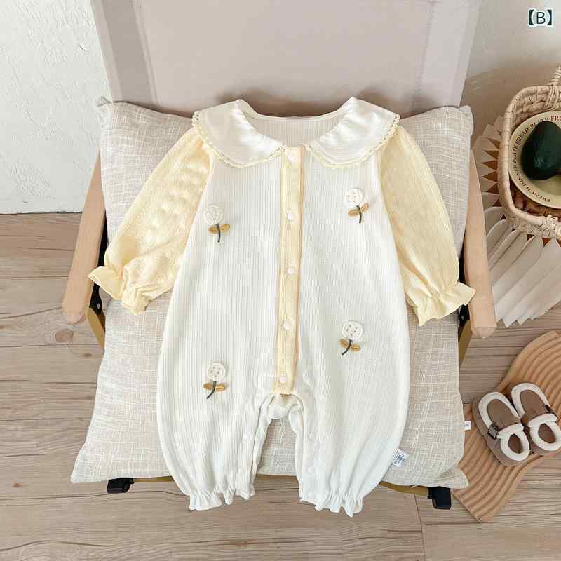 ロンパース 女の子 ベビー カバーオール 薄手 長袖 かわいい 春秋 お出かけ着 普段使い ポリエステル混紡 前開き スナップボタン スウィート ピンク イエロー |