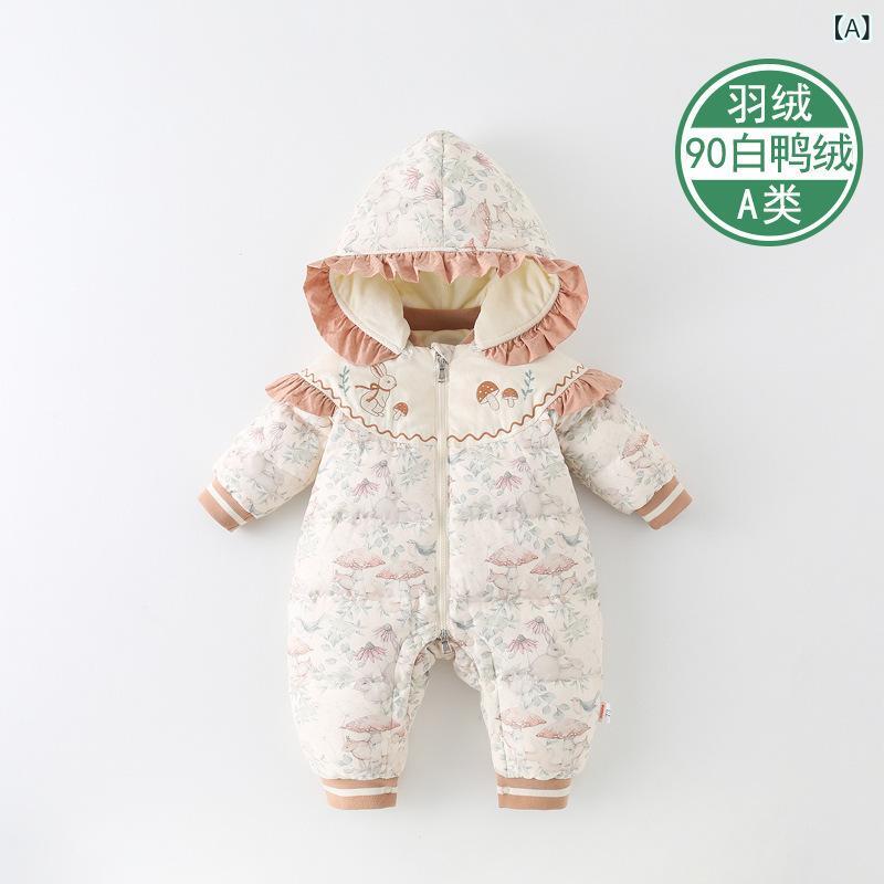 ベビー カバーオール 女の子 ダウン 厚手 裏起毛 小花柄 かわいい 韓国風 冬 防寒 あったか フード付き ホワイトダックダウン お出かけ着 アウター |
