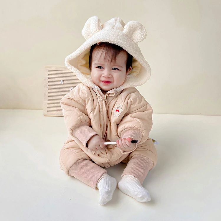 ベビー カバーオール 冬服 防寒着 ジャンプスーツ くま耳 フード付き 男の子 女の子 子ども キッズ 中綿 コート 裏ボア アウタ |