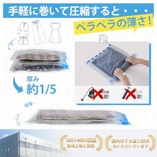 【送料無料】Hoxhyon 圧縮袋 旅行 衣類圧縮袋 約80%圧縮 真空あっしゅく袋 洋服 ダウン アウター 毛布 薄手の布団 掃除機不要 手巻き 防カビ 防虫 衣替え 収納 トラベル 出張 引っ越し 家庭用 再利用可能 旅行便利グッズ |