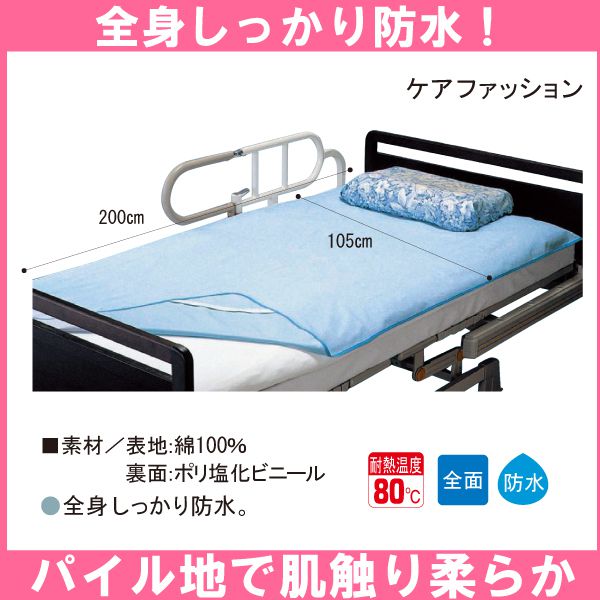 ケアファッション 綿パイル防水シーツ (大判:幅105×200cm)(ブルー)(耐熱温度80℃) 全面シーツ 四隅ゴムタイプ 防水シーツ おねしょシーツ 失禁シーツ 介護シーツ 【送料無料】【ポイント10倍】 |