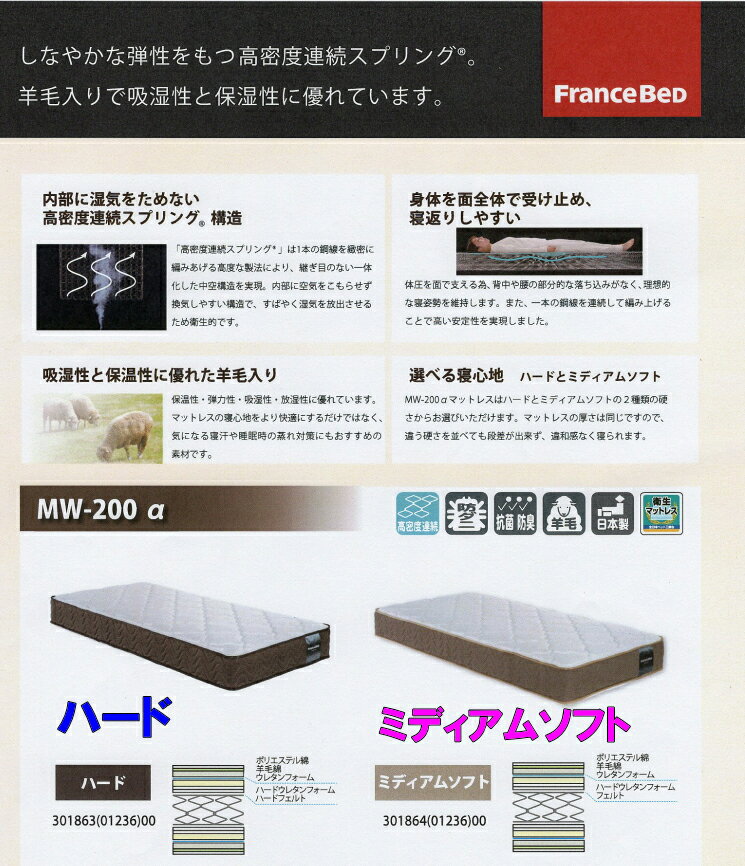 【お得な2枚セット】フランスベッド 公式パートナー セミシングル クィーン マットレス MW-200α ミディアムソフト マットレス2枚セット セミシングルサイズ クィーンサイズ スプリングマットレス 吸湿 保湿 送料無料 羊毛 両面 抗菌 防臭 防ダニ 通気性 中反発 日本製 |