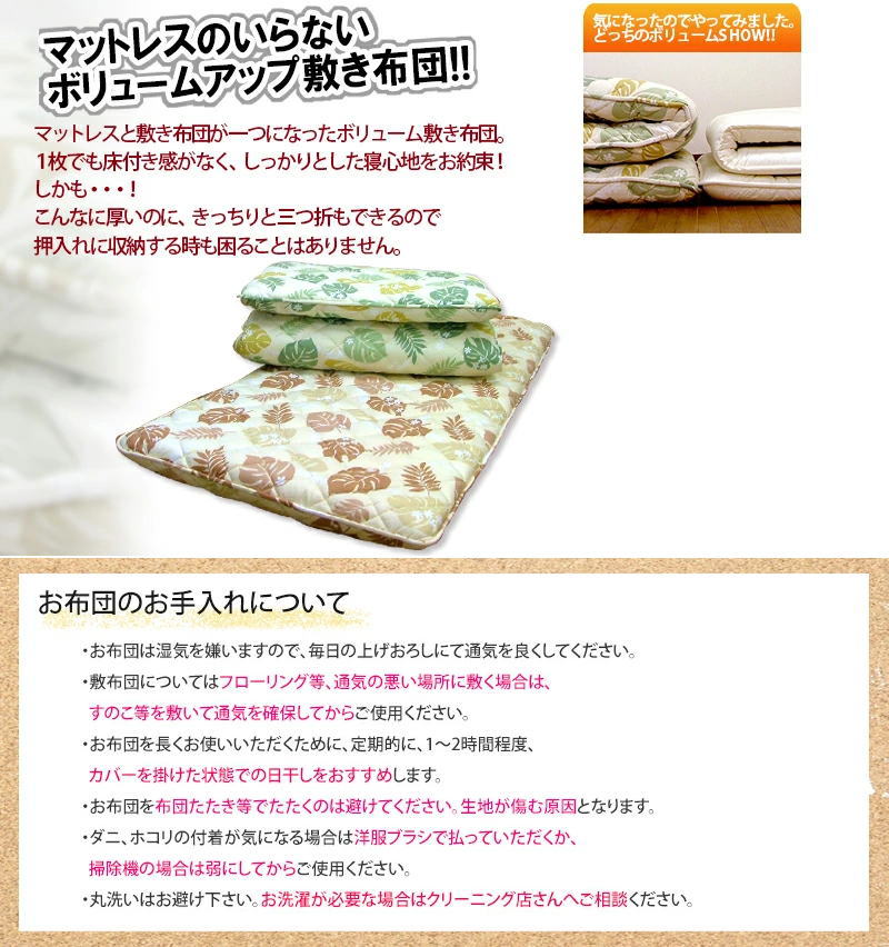 ボリュームアップ 敷布団 シングル 100×205cm 日本製 防ダニ抗菌防臭素材を使用 【関連ワード ケパック 敷き布団 しきふとん マットレスのいらない 三つ折り 防ダニ布団 防ダニ敷布団 軽量 軽い モンステラ アレルゲン】 |