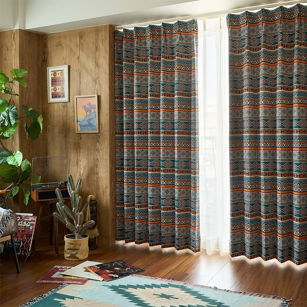 【1/20限定 ポイント10倍】1級遮光カーテン 大地と空の記憶を映す、ターコイズブルーのアズテック柄カーテン <アズテック ターコイズ> |