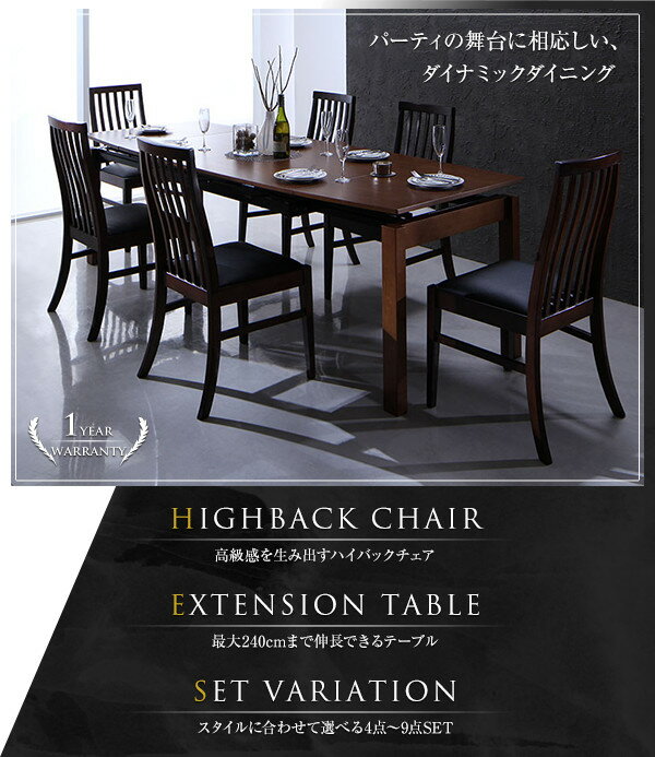 ハイバックチェア ウォールナット材 スライド伸縮式ダイニング 6人 6点セット(テーブル+チェア4脚+ベンチ1脚) W140-240 |