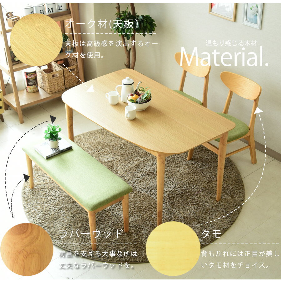 ダイニングテーブル 4人掛け 幅130cm 4点セット ダイニングセット 変形 オーク タモ 突板 ラバーウッド 無垢フレーム ナチュラル 食卓 北欧 ダイニングチェア ベンチ おしゃれ シンプル グリーン ファブリック |