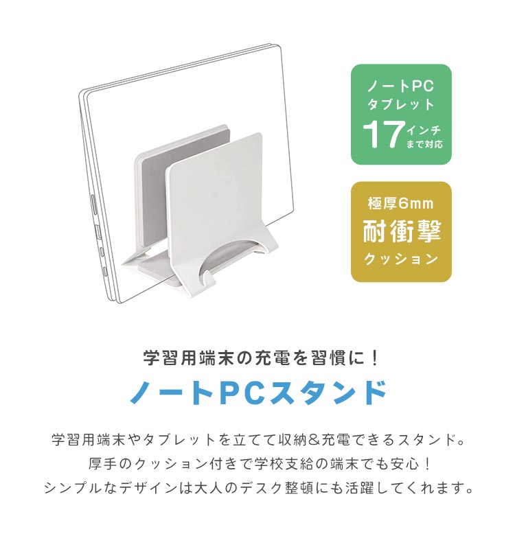 ノートPCスタンド パソコンスタンド ノートパソコン 収納 16インチ 17インチ 端末 学習用タブレット ホルダー ホワイト 卓上 縦置き 充電スタンド クッション付き 立て掛け たて スチール 金属製 白 スリム シンプル 底面滑り止め 転倒防止 デスク オフィス 整頓 学習机 |