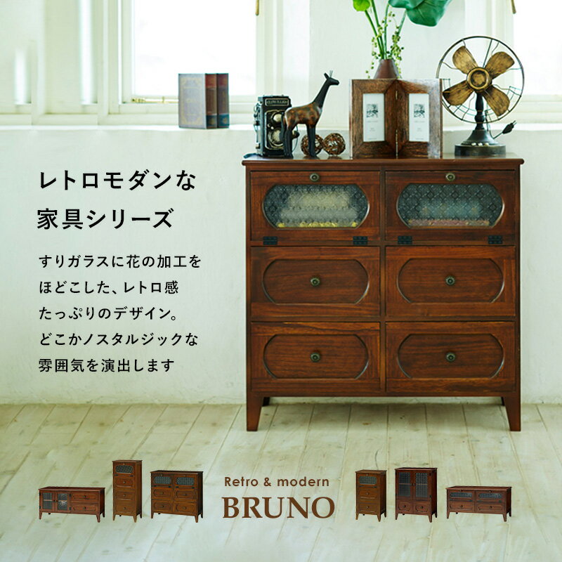 【10%クーポン配布中★2/1(日)限定】レトロ花ガラス チェスト3段6杯【Bruno】ブルーノシリーズ【完成品】(おしゃれ 完成品木製 アンティーク リビングボード 整理タンス サイドチェスト モダンチェスト フラップ扉 ビンテージ風) |