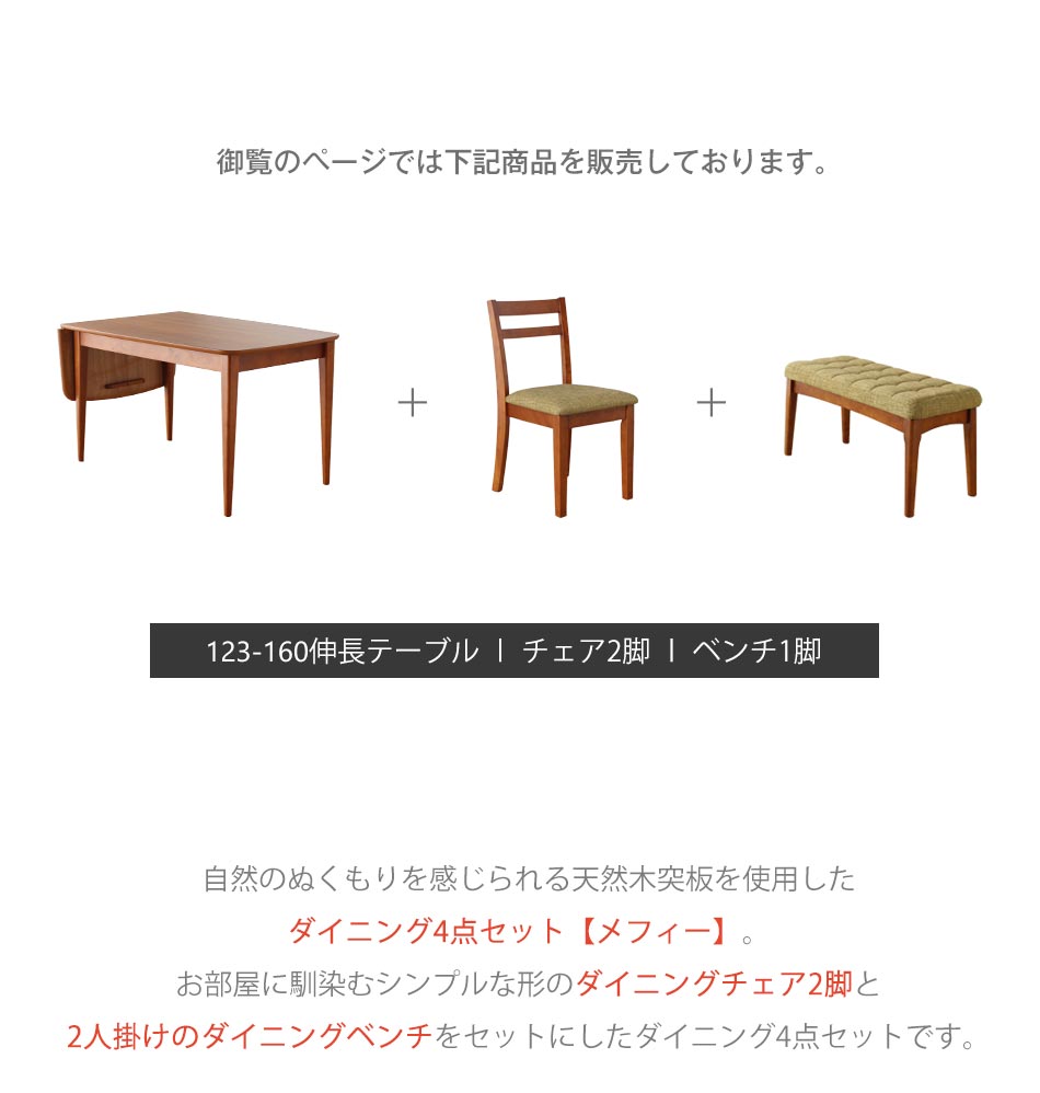 ☆全品10%OFFクーポン 伸長式ダイニングテーブル4点セット 幅123-160cm+ダイニングチェア2脚+ベンチチェア ダイニングセット /ウォールナット 【送料無料】〔中型〕エクステンションテーブル/バタフライテーブル/木製/ナチュラルダイ |