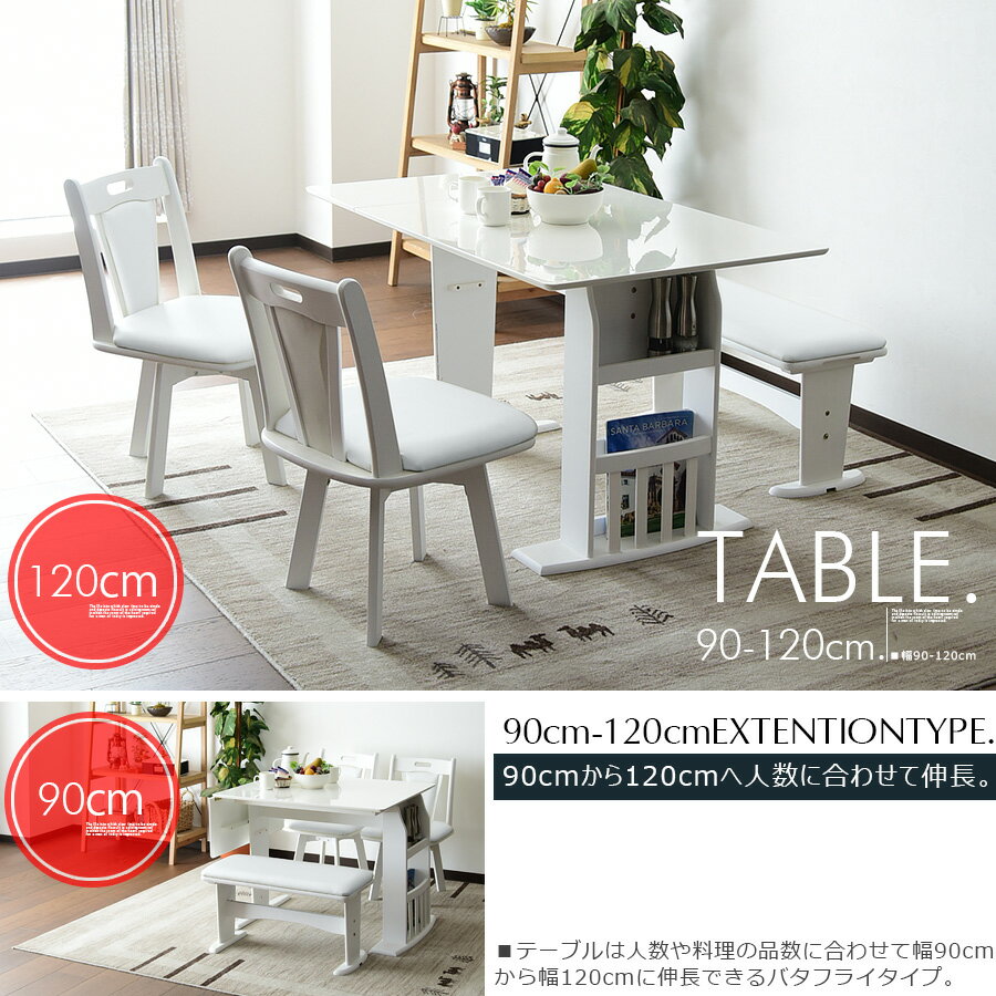 ダイニングセット ダイニングテーブルセット 4人掛け 幅90cm〜120cm ベンチ 伸縮式 4点 伸長 4人用 ホワイト 白 光沢 コンパクト バタフライ 片バタ 食卓 収納 回転椅子 回転チェア 2人掛け マガジンラック シンプル 北欧 |