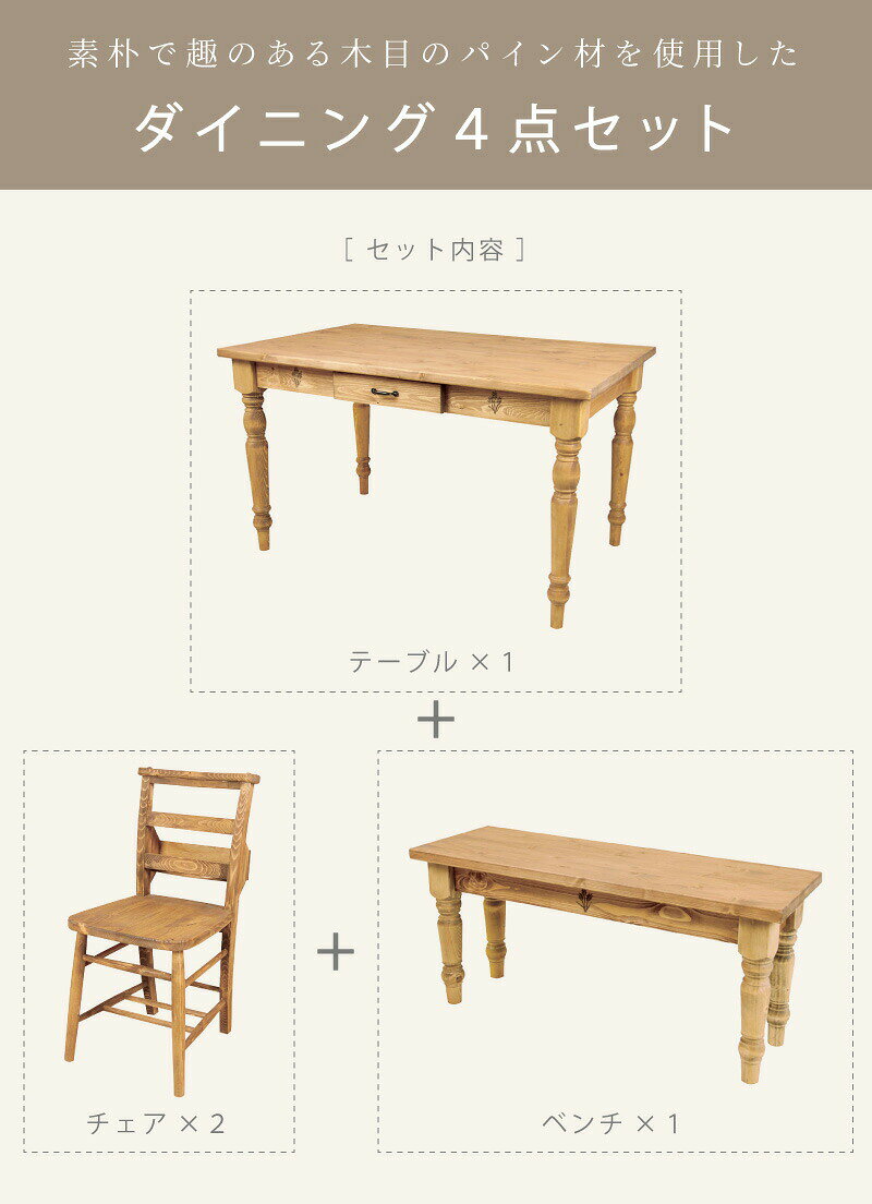 【開梱設置付】ダイニング4点セット ダイニングセット ダイニングテーブル ダイニングチェア ダイニングベンチ 食卓 天然木 パイン 無垢 無垢材 北欧 おしゃれ おすすめ シンプル ナチュラル カントリー 幅150cm |
