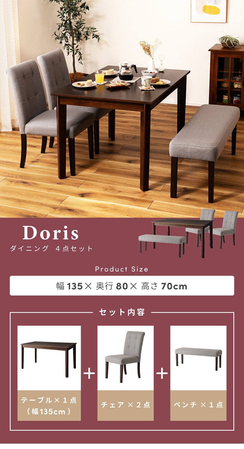 ダイニングテーブルセット ダイニングセット 4人掛け 4人用 4点 135×80 幅135cm 木製 天然木 アカシア チェア チェアー 椅子 ベンチ 食卓 机 コンパクト おしゃれ 高級感 アンティーク モダン シンプル ダークブラウン グレー |