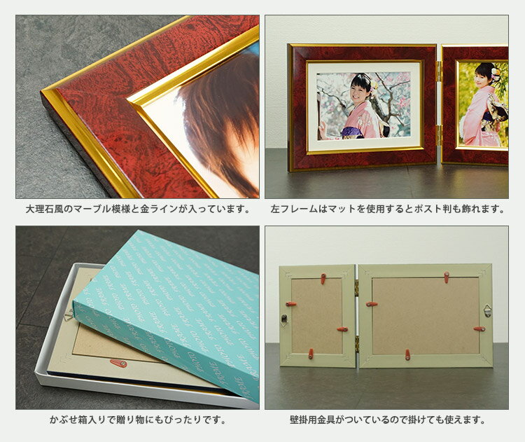 大理石調 全4色 ツインフレーム 2L判・L判 万丈 キャメル/ワイン/エメラルド/ブルー 額縁 写真立て フォトフレーム 2枚 2面 壁掛け ギフト 記念品 高級 上品 おしゃれ クラシック |