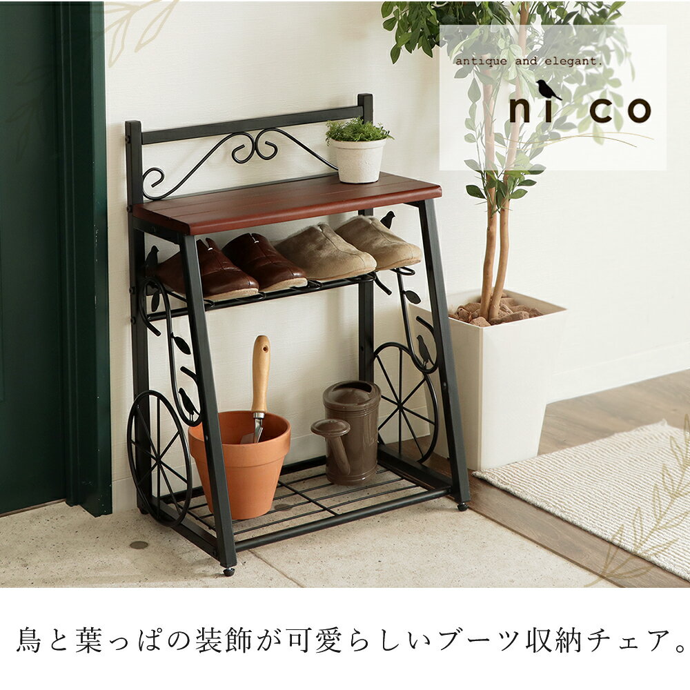 【LINE追加300円クーポン】長靴 ブーツ収納 チェア 椅子 ベンチ レインブーツ 腰掛け スツール かわいい 北欧 レトロ 玄関収納 屋内 木製 スチール アンティーク ブラウン ブラック リーフ 鳥 スチール ラック nico ニコ |