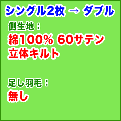 羽毛布団 打ち直し【柄お任せスペシャルコース】サイズ変更 シングル2枚からダブル1枚+保管サービス 羽毛布団リフォーム(プレミアムダウンウォッシュ) 立体キルト 綿100% 60サテン 側生地使用 |