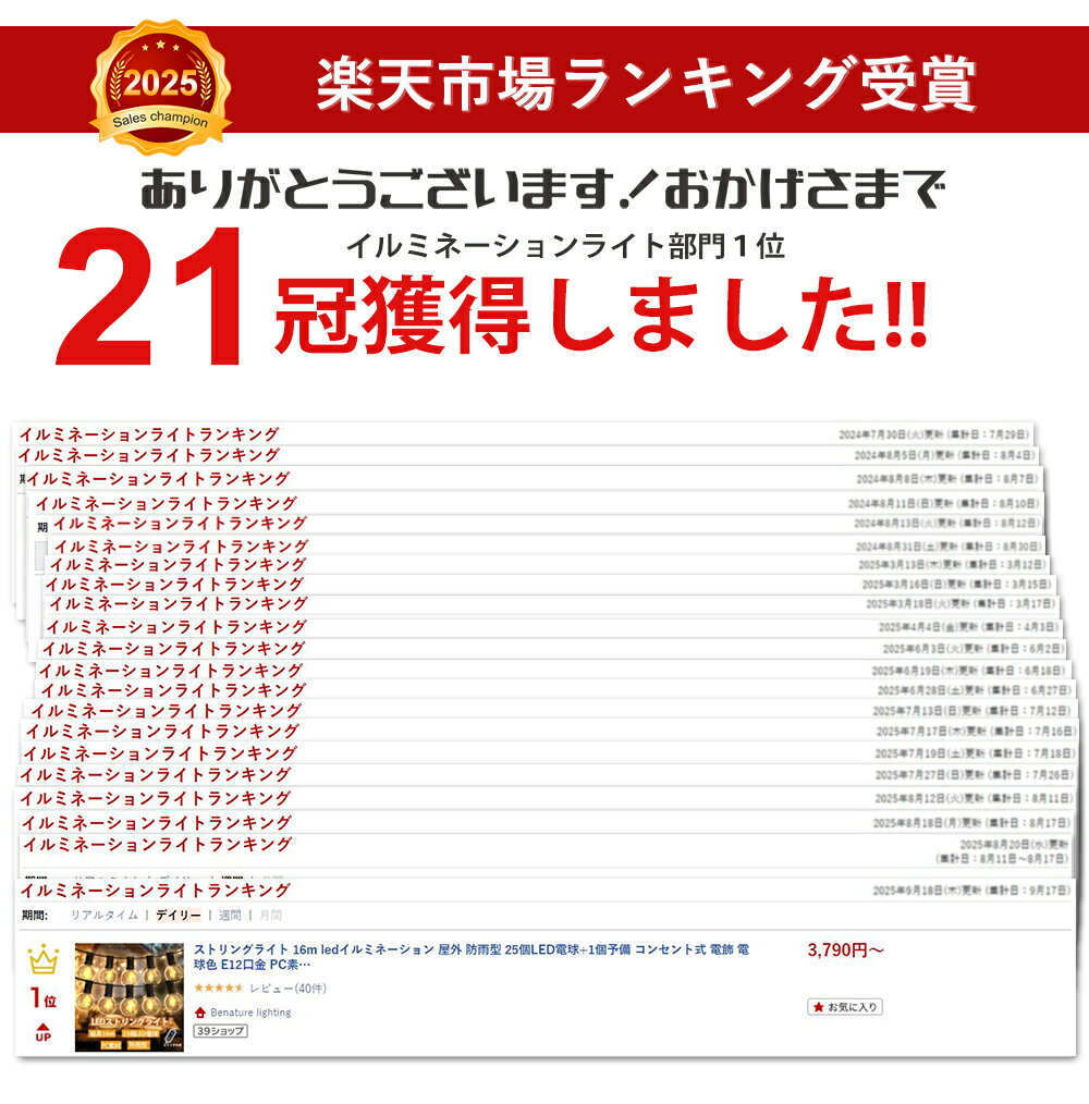 ストリングライト 16m ledイルミネーション 屋外 防雨型 25個LED電球+1個予備 コンセント式 電飾 電球色 E12口金 PC素材 破損しにくい 連結可能 屋内照明 ガーデンライト 新年 電飾 節電 結婚式 誕生日 庭 祭り 商店街 |