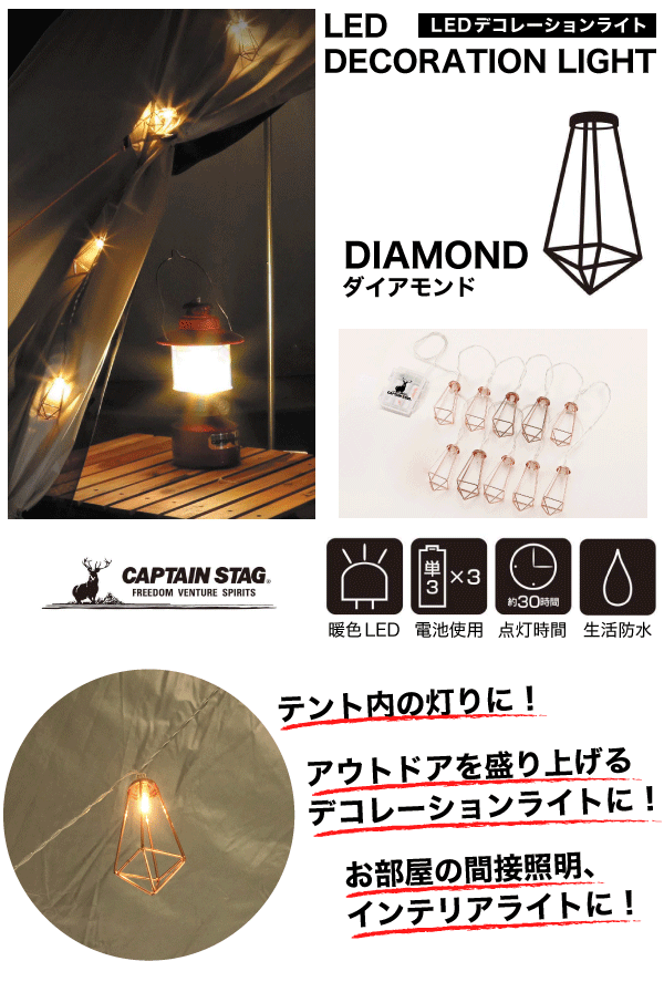 LED デコレーションライト ダイアモンド型 10灯 アウトドア キャンプ テント 飾り付けライト 装飾ライト おしゃれ 電球 インテリアライト イルミネーション 吊り下げ ランタン クリスマス パーティー ライト CAPTAIN STAG【UK-4054】 |