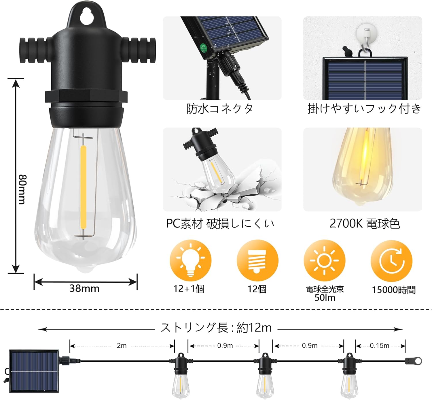 【11%オフクーポン使用可】LEDストリングライト ソーラーストリングライト&コンセント式 スイッチ付き 屋外 防雨型 電球色 延長コード PC素材 破損しにくい E12ソケット 連結可能 室内照明 キャンプライト クリスマス電飾 結婚式 庭 誕生日 商店街 11.8m/12m/14.8m/24m |