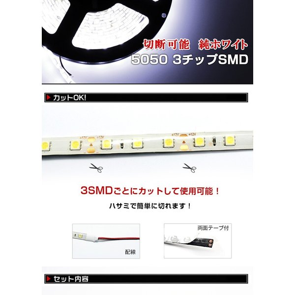 12V専用 5M 切って使えるledテープ300SMD 5050LEDイルミネーションテープライト 白ベース ホワイト防水 |