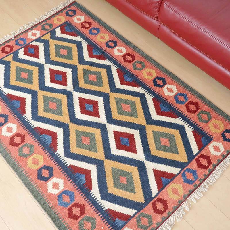 キリム イラン・シラーズ産 玄関マット 119×81cm 手織り 小さめ ラグ ウール 100% おしゃれ 北欧 アジアン エスニック 夏用 洗える ホットカーペット対応 床暖房対応 ラグマット 絨毯 平織り キリム柄 kilim (品番:KS-449) |