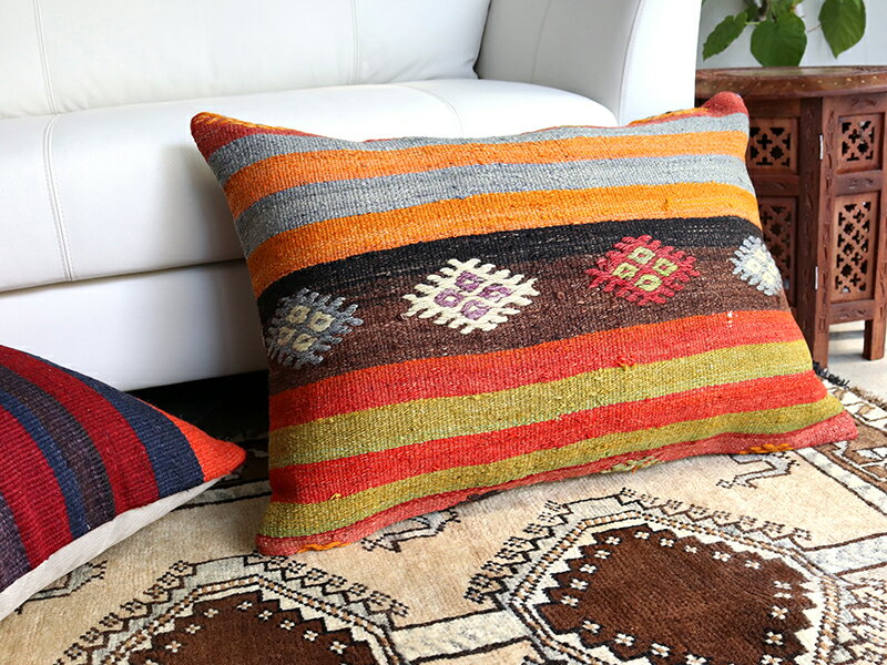 オールドキリムクッション・長方形ビッグピロー Turkish Old Kilim Cushion 70x50cm シンプルボーダー・ひし形のジジム |