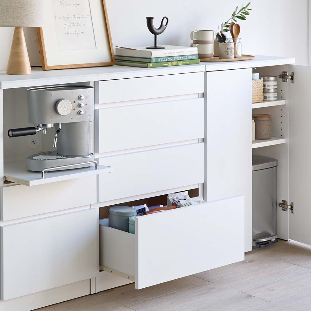 【Late】ラテシリーズ 家電収納キッチンボード 幅90 高さ160〜200 ホワイト色 スライド棚 食器棚レンジラック収納 カップボード キッチン収納 北欧 ホワイト ラック棚 おしゃれ キッチンラック レンジボード シンプル カフェ風 木目 木製 フレンチカントリー |