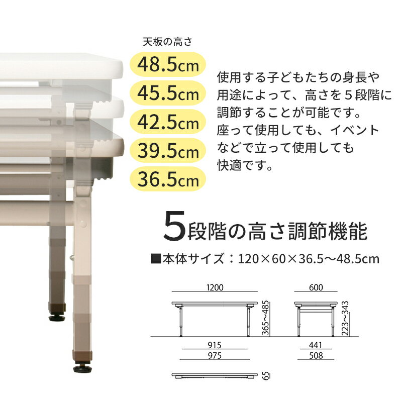5段階テーブル(幅120cmタイプ) ENT-1260V 抗ウイルス仕様 キッズテーブル 幅120cm 業務用テーブル 昇降式テーブル 高さ調節 高さ調整 業務用机 幼稚園テーブル 保育園テーブル 幼児教室 おすすめ かわいい おしゃれ |