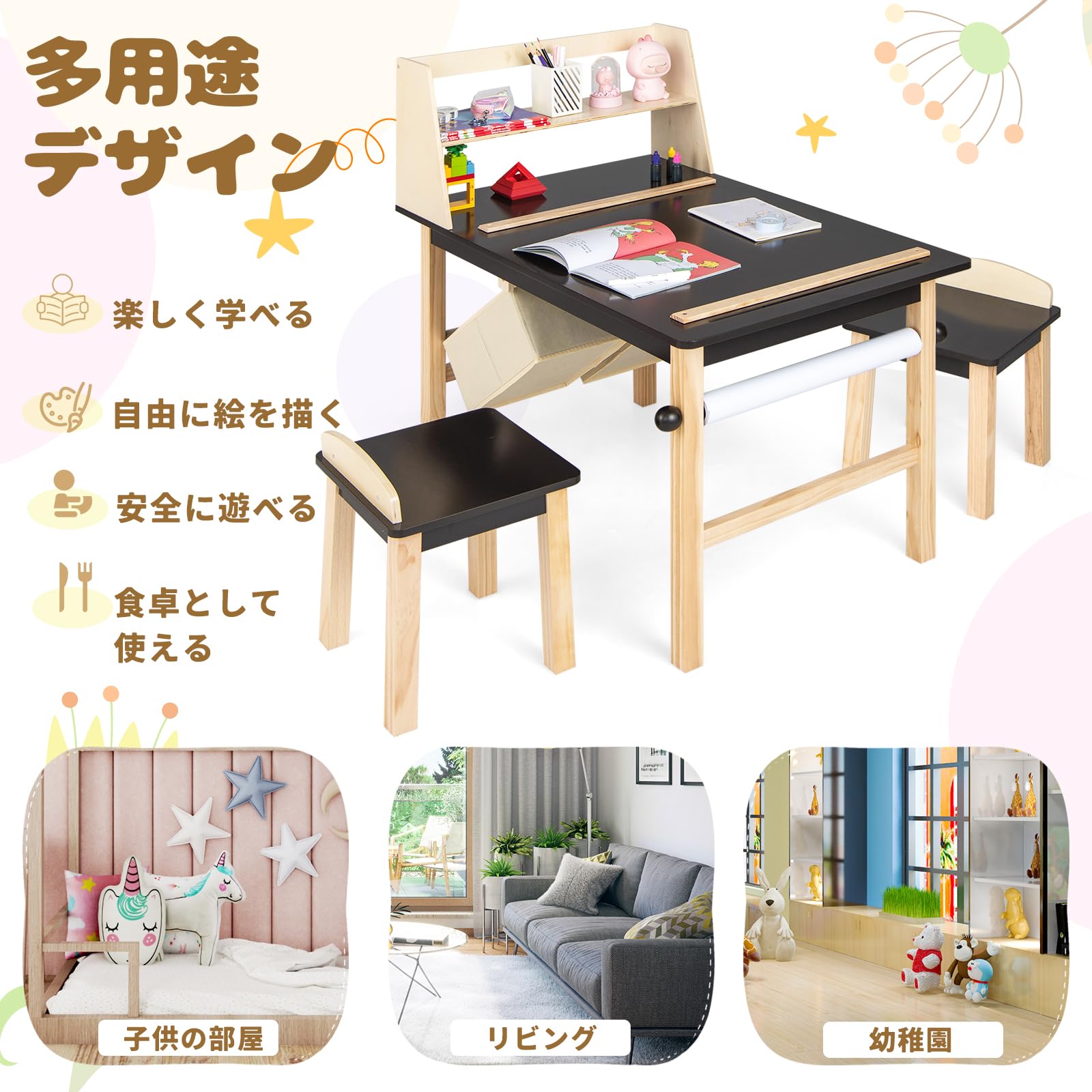 Giantex 子ども用テーブルと椅子3点セット 木製 お絵かきテーブル ロール紙ホルダー付き 収納バスケット付き 大容量収納 子供デスクセット キッズテーブルチェアセット 多機能 学習机 絵本読み 絵かき ダイニング プレイセット 入園祝い (ナチュラル |