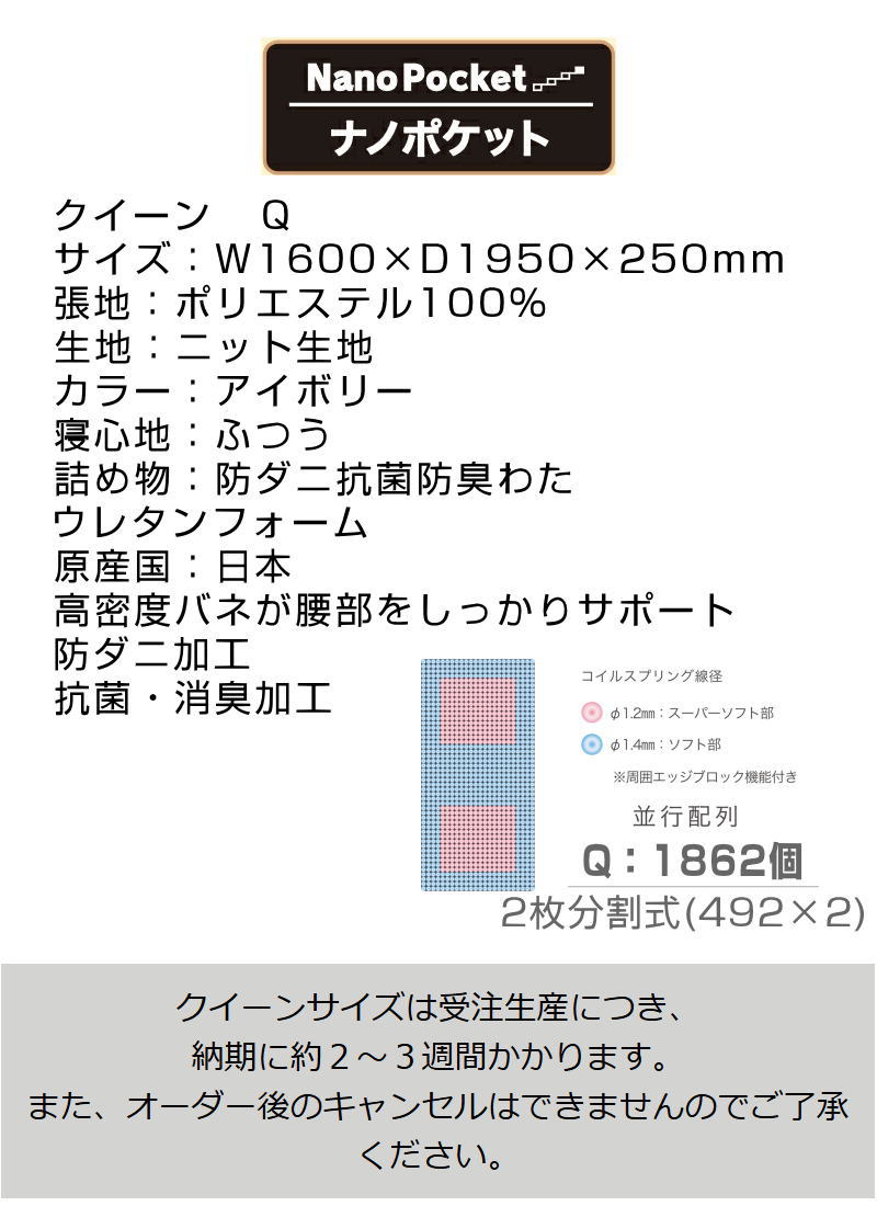 グランツ グランネオユニット Nano Pocket Q クイーンサイズ マットレス2枚組 ナノポケット 寝具 ポケットコイル ふつう 防ダニ加工 抗菌・防臭加工 日本製 スプリング数 1862 並行配列 アイボリー玄関先までのお届けです。 |