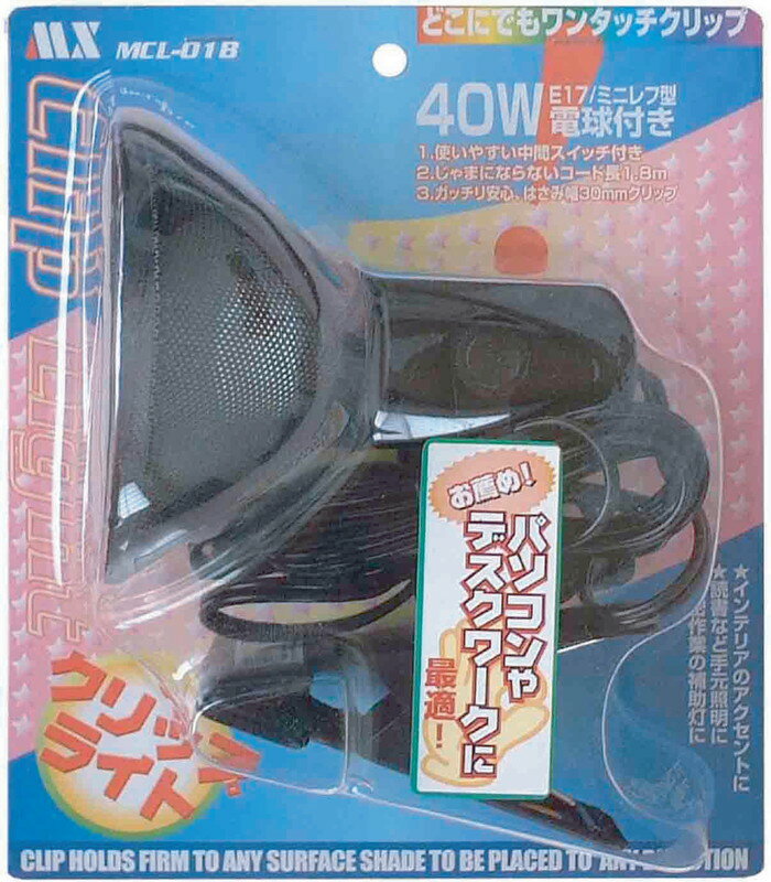 【訳あり】【アウトレット】【パッケージ破損品】クリップライト40W型 E17 レフランプ付き白熱電球(LED電球使用可)ON/OFFスイッチ付きクリップはさみ幅:30mmMCL-01Bスポット照明、インテリアライト、作業などに。 |