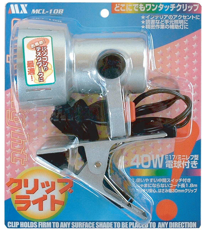 【訳あり】【アウトレット】【パッケージ破損品】クリップライト40W型 E17 レフランプ付き白熱電球(LED電球使用可)ON/OFFスイッチ付きクリップはさみ幅:30mmMCL-10Bスポット照明、インテリアライト、作業などに。 |
