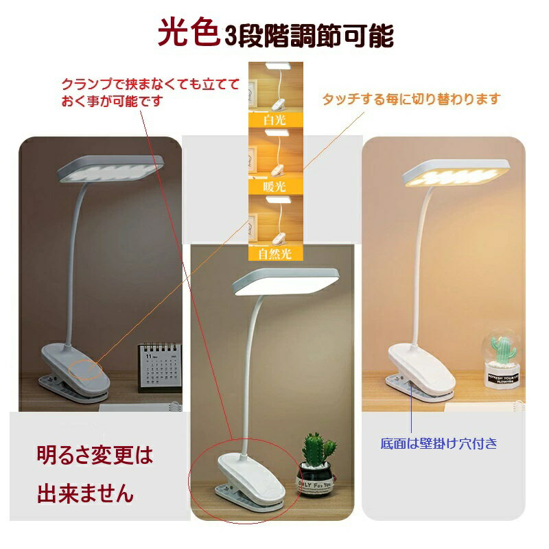 クリップライト デスクライト 3種類調色 光色変更 卓上 ライト 暖色 昼光色 白色 USB電源 充電式 優しい光 LED 360°回転 フレキシブル dar-clipstand ホワイト |