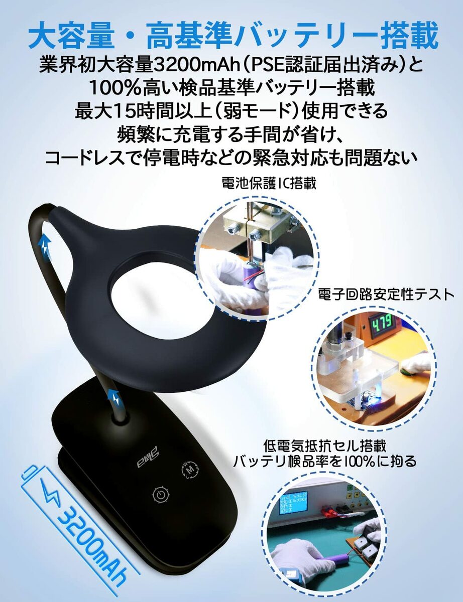 クリップライト コードレス LEDブックライト デスクスタンド PSE認証済み 超大容量3200mAh 2022年進化モデル TYPE C充電式 360度回転 タッチ式三段階調光 USB充電 電気スタンド Web会議面接 PC作業 ドレッサー 読書 哺乳 譜面 3段階色温度(暖色 昼色 白色)3段階光度調節可 |