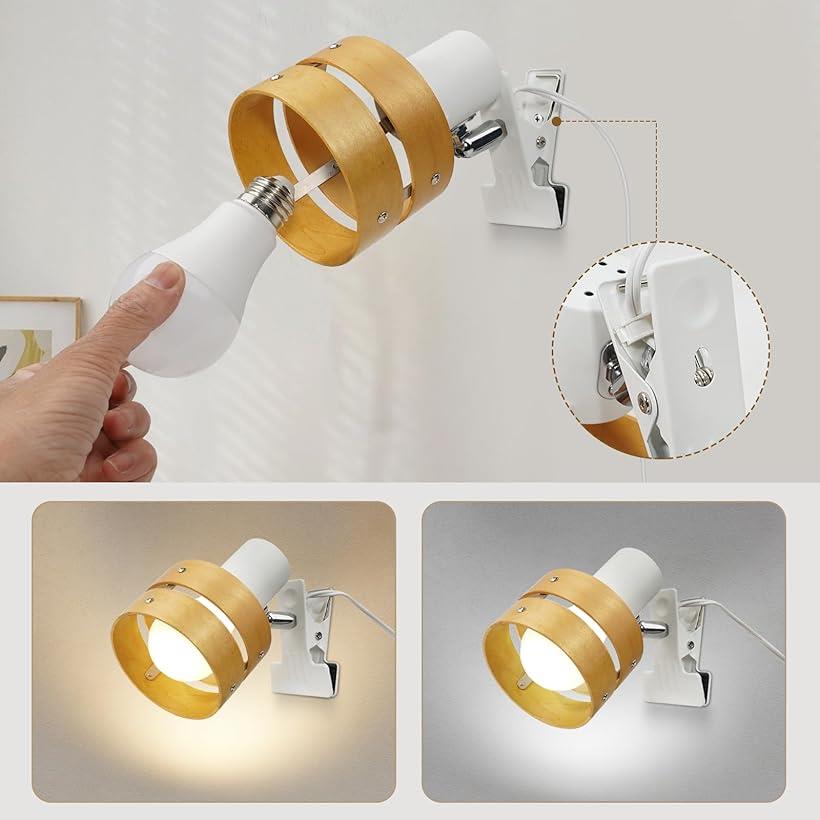 クリップライト 茶色の木製の円 E26対応 360度回転 スイッチ付き 高級 目に優しい 節電 省スペース設計 寝室 ベッドサイド デスクライト 読書用 高級レストラン照明 植物育成ライト対応 (ホワイト, 調光の電球+リモコン対応) |