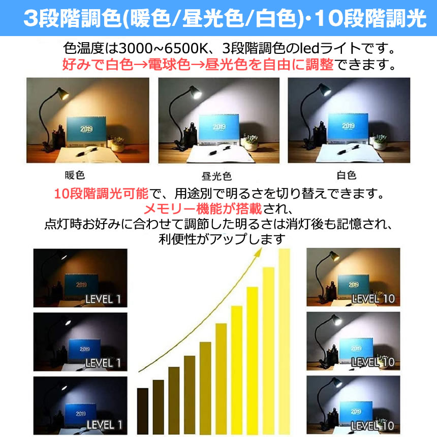 クリップライト デスクライト 10段調光 3段調色 光色変更 卓上ライト 3段調色 暖色 昼光色 白色 USB電源 明るい LED 360°回転 フレキシブル el-cliplight01 |
