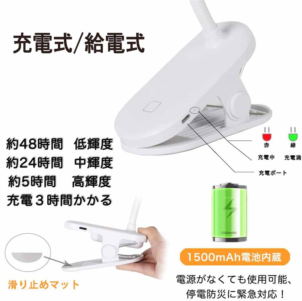 【即納】デスクライト 目に優しい クリップライト 読書灯 3段階 1000mAH大容量 ブックライト 卓上ライト クランプ式 USB充電式 360°回転 手元ライト 持ち運び便利 ドレッサー 勉強 子供 寝室 卓上 哺乳 明るい ベッド 停電 防災用 送料無料 |