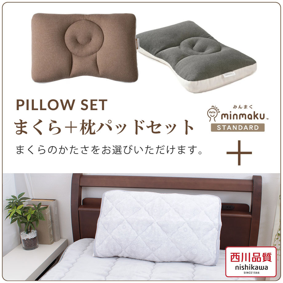 \SS特価/【お得な枕パッドセット】みんまく 100万人のデータから生まれた みんまく STANDARD minmaku スタンダード じぶんまくら 枕 肩こり 首こり ピロー やわらかめ かため 43×63cm 通気性 ハッピーバッグ 西川 暖かまくらパッド付 吸湿発熱 抗菌 カバー付 |