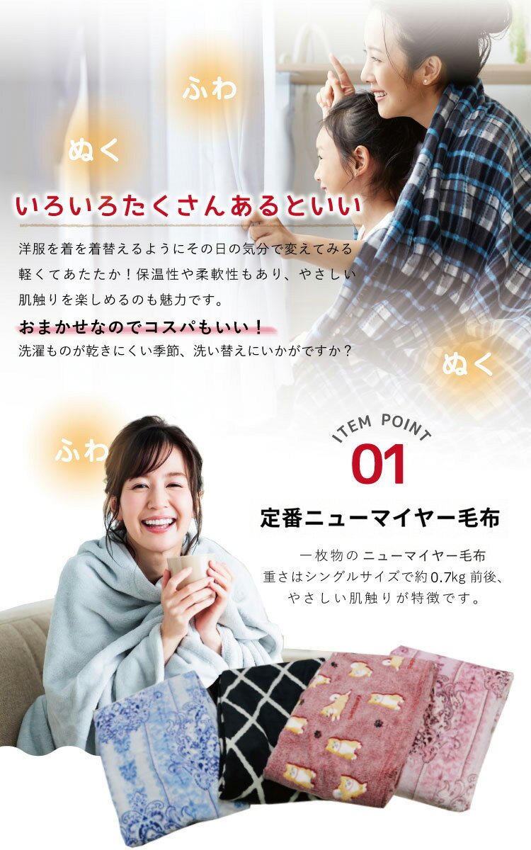 毛布 送料無料 色柄おまかせ ニューマイヤー毛布 シングル ダブル ハーフ ひざ掛け ポリエステル100% あったかブランケット 暖か もうふ 冬用 寝具 車中泊対策 節電 丸洗いOK ふわふわ 柔らか 旅行用 客用 子ども ペット |