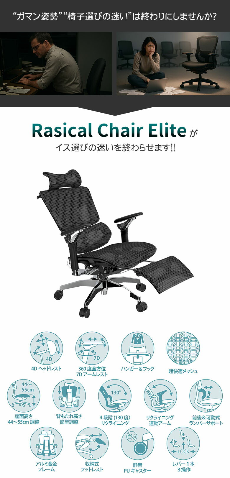 【6000円OFFクーポン利用可!】Rasical Chair Elite ラシカルチェア エリート ブラック カスタムチェア 自分仕様 ワークチェア オフィスチェア デスクチェア パソコンチェア PCチェア リクライニング おしゃれ スタイリッシュ ランバーサポート 7Dアームレスト |