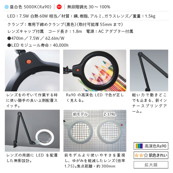 タスクライト デスクライト LED クランプ式 無段階調光 高演色 拡大鏡 拡大レンズ ホワイト/ブラック Z-LIGHT Zライト 山田照明 Z-37RL W/B |