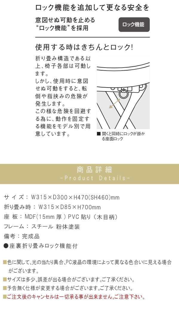 フォールディングスツール 1脚のみ 幅31.5cm 座高46cm ロック機能付き 補助椅子 椅子 イス いす コンパクト 折り畳みチェア 折り畳み機能付き 便利 QSM-140 家具 |