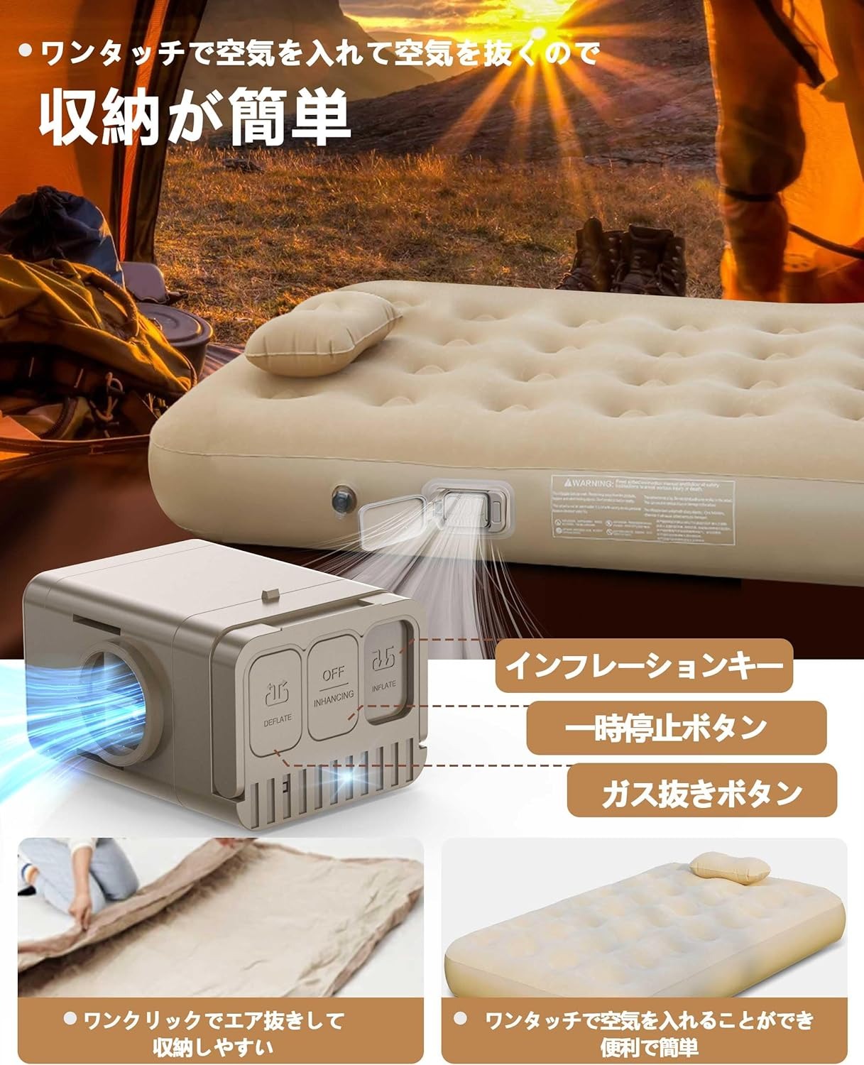 インフレータブルベッド シングルサイズ 電動インフレータブルマットレス インフレータブルベッド キャンプマット インフレータブルパッド 電動ポンプ ワンボタン自動膨張/収縮 折りたたみ式 超軽量 高反発 収納バッグ付き コンパクト 防水 通気性 快適 |