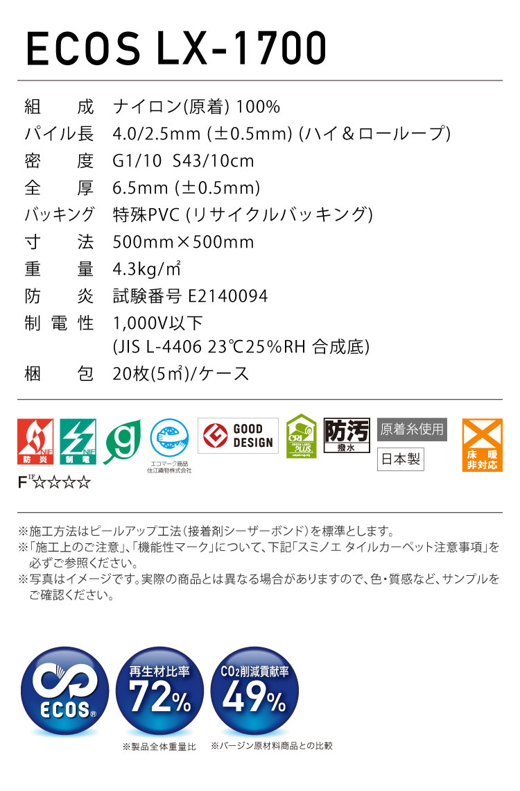 スミノエ タイルカーペット ECOS LX シリーズ LX-1700 SURF LX-1701 LX-1703 LX-1704 LX-1705 LX-1706 LX-1707 LX-1709 50×50 50cm角 パネルカーペット 無地 |