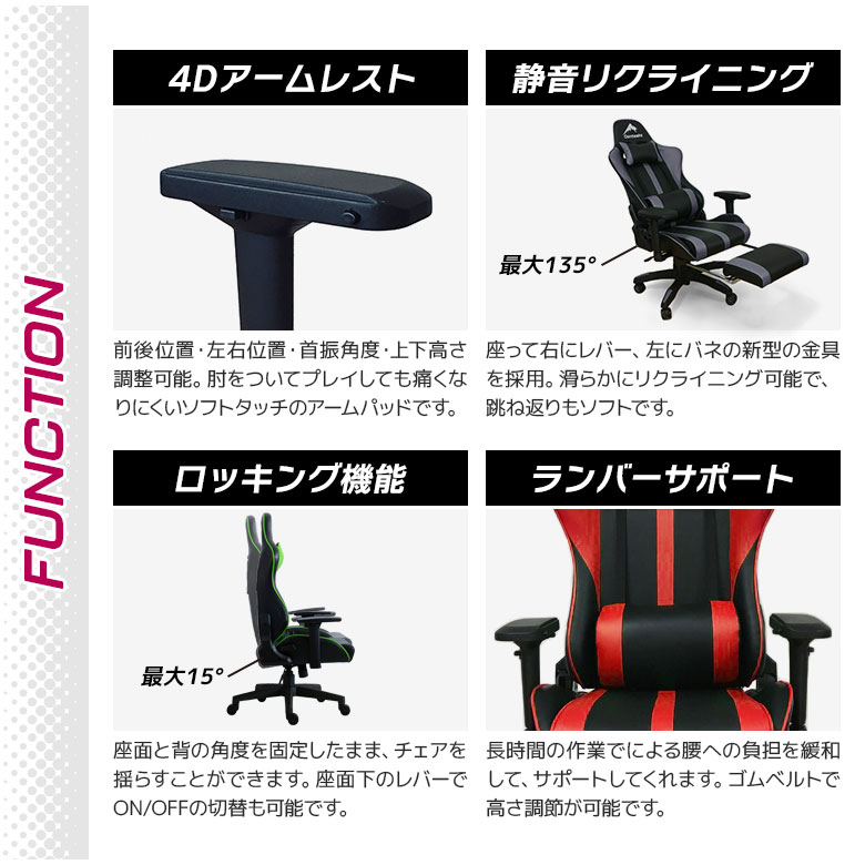 ゲーミングチェア eスポーツ ゲーム用 オフィスチェア パソコンチェア フットレスト オットマン付 リクライニング デスクチェア 昇降チェア ワークチェア OAチェア 360度回転 肘置き キャスター ハイバック eスポーツチェア SEA03 |