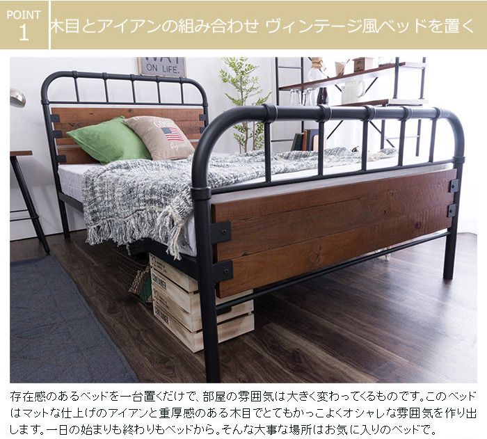 ヴィンテージ調アイアンベッド シングル クルーズ ポケットコイルマットレス付き 高さ2段階調整 パイプベッド(代引不可)【送料無料】 |