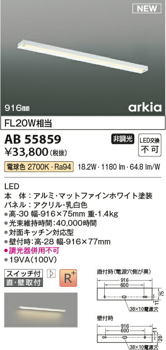 コイズミ照明 AB55859 LED手元灯用ブラケットライト arkia 電球色 FL20W相当 非調光 スイッチ付 直・壁取付 W916mmタイプ コイズミ照明 照明器具 壁付け |