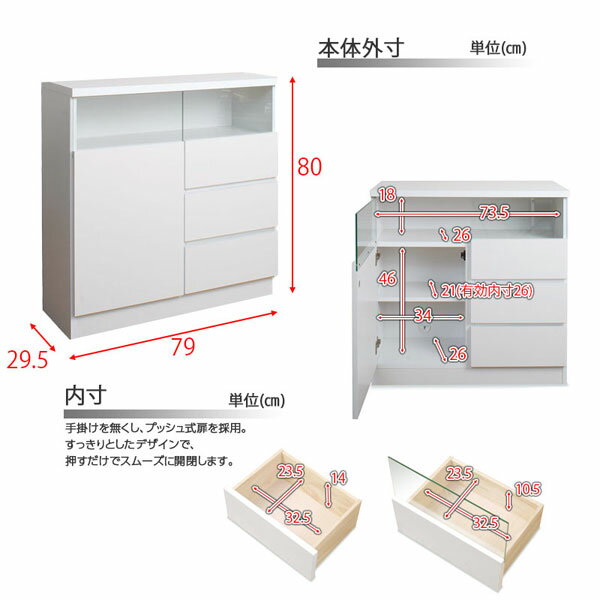 リビングキャビネット幅80引出 ホワイト NO-0002 【送料無料】完成品 [カウンター下収納 幅80 奥行30 高さ80 リビング収納 ディスプレイ収納 プッシュ扉] |