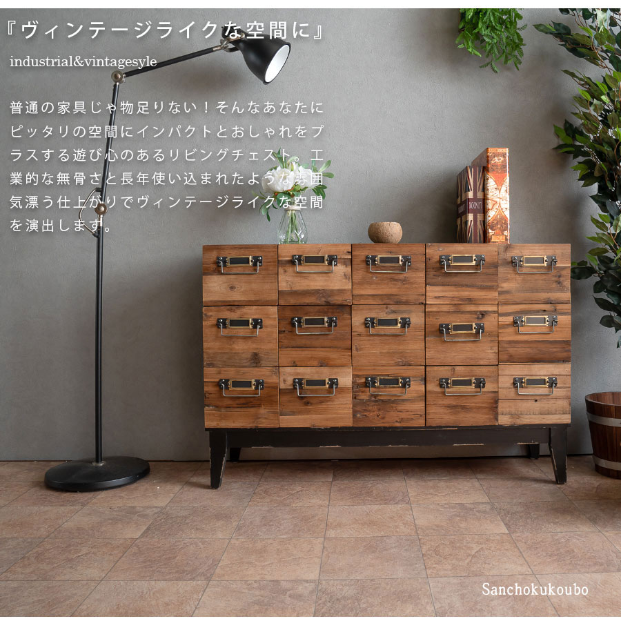RIS 幅108.5cm 3段 -15杯引き出し 完成品 リビングチェスト サイドボード リビングボード ローチェスト おしゃれ エイジング ヴィンテージ感 収納家具 リビング収納 インダストリアル かわいい 高さ72.5cm 個性的 リビング収納 ダメージ加工天然木 産地直送価格 卸売り [PR] |